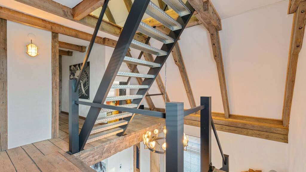 the spacious living room offers beautiful views of the gaasterland natural landscape from virtually every window. wherever you sit or stand, the surrounding nature becomes part of the interior experience. the atmosphere is defined by robust exposed beams, hardwood floors, a stylish fireplace with wood-burning stove and an impressive aluminium stair hall.