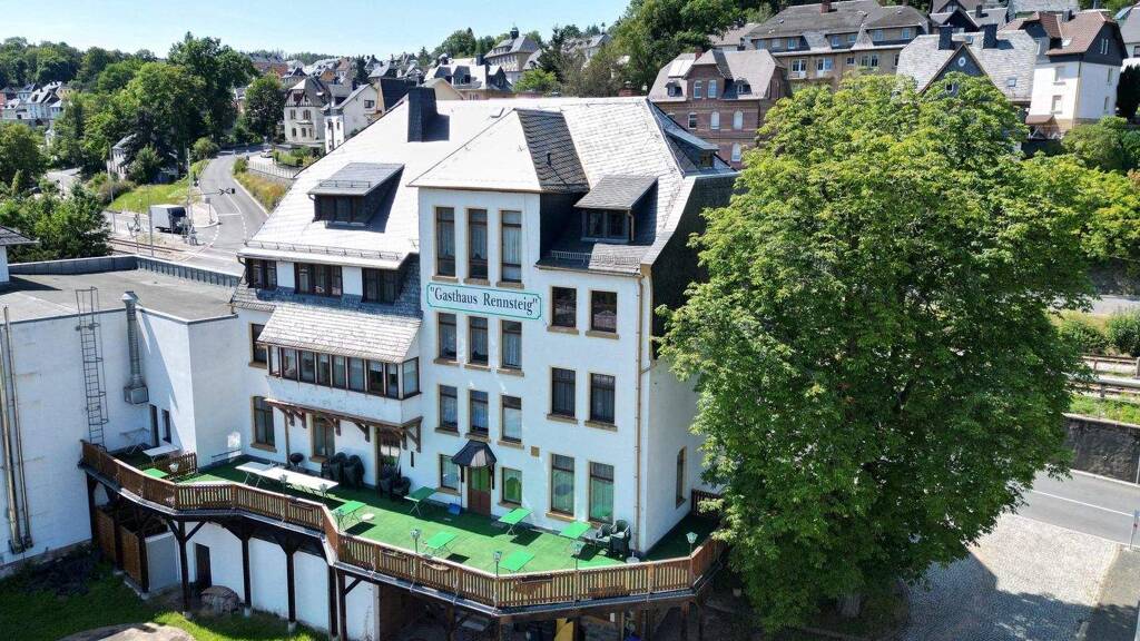 Das 1901 erbaute Gebäude wurde 1993 saniert und in ein Hotel umgebaut. Das Haus verfügt in zwei Gasträumen über 100 Plätze und auf der Terrasse mit Saaleblick stehen nochmals 50 Plätze zur Verfügung. Die voll ausgestattete Küche und die gesamte Betriebs- und Geschäftsausstattung inklusive Zimmereinrichtungen werden mit verkauft.