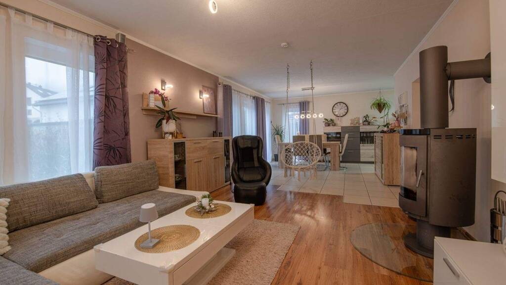 Zu den Highlights zählen unter anderem eine Sauna, Fußbodenheizung im gesamten Haus, eine große Terrasse, eine Einbauküche sowie zwei Schwedenöfen.