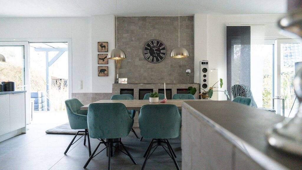 Bereits beim Betreten des Hauses wird das großzügige und offene Wohnkonzept deutlich. Der lichtdurchflutete Wohn- und Essbereich mit offener moderner Küche bildet das Herzstück des Hauses und schafft eine einladende Atmosphäre für das Familienleben sowie für gemeinsame Abende mit Freunden. Ein Kaminofen sorgt zusätzlich für behagliche Wärme und eine gemütliche Wohnatmosphäre.