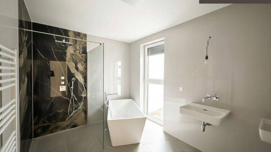 Das Tageslichtbad, die hochwertigen Böden in Landhausdielen-Optik und die moderne Haustechnik unterstreichen den hohen Wohnstandard dieser Einheit.