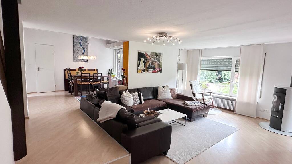 Die bezaubernde Haushälfte (140 qm) mit großem Garten gliedert sich im licht-durchfluteten Erdgeschoß in Diele, ein Gäste-WC, die Küche, ein Abstellraum, in den Ess- und Wohnbereich mit großem Panoramafenster sowie einer großen, überdachten Terrasse und Garten - beides südseitig ausgerichtet. Der gepflegte Garten steht zur Nutzung zur Verfügung.