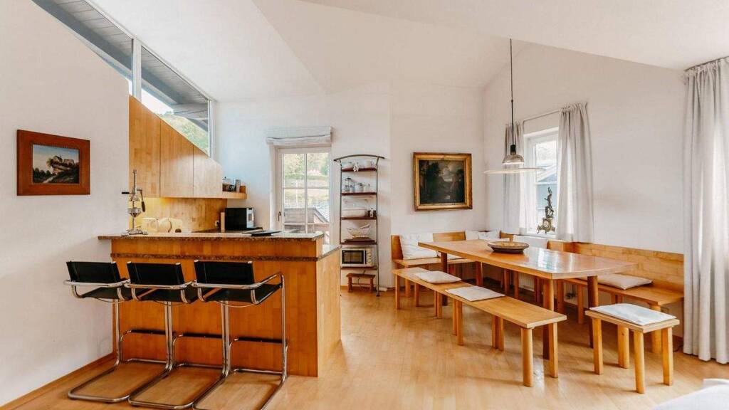 Der Wohnbereich besticht durch einen wunderschönen Kachelofen und grenzt an den offenen Essbereich sowie die Küche. Auf der ersten Ebene befindet sich zudem ein kleines Schlafzimmer, das auch als Büro genutzt werden kann, sowie ein separates WC. Vom Wohnbereich aus gelangen Sie auf den großzügigen Balkon, der nach Südwesten ausgerichtet ist und einen herrlichen Blick auf die Kitzbüheler Ache und den Hahnenkamm bietet.