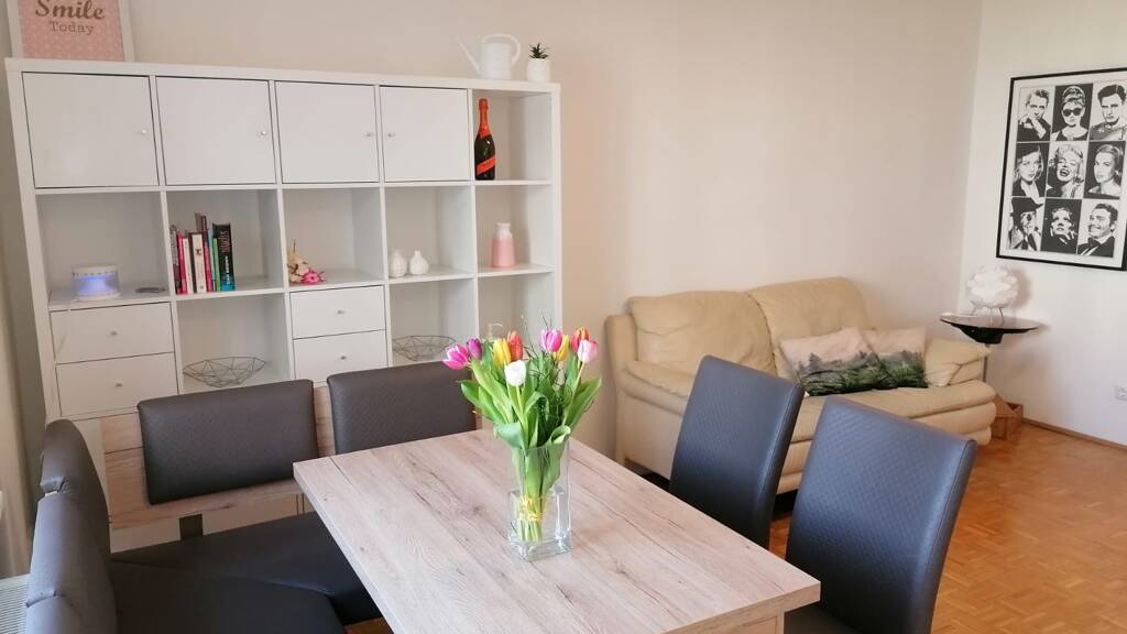 Die Wohnung überzeugt daher durch ihre Lage und Raumaufteilung. Sie hat einen offenen Wohn- Essbereich, zwei Schlafräume inklusive einer Home-Office fähigen Büroecke. Auch das kleinere Schlafzimmer ist aufgrund der Stapelbetten in ein Zweibettzimmer verwandelbar. Für Kleinkinder und Babys wird ein Hochstuhl und ein Gitterbett zur Verfügung gestellt. Ein getrenntes Bad und WC sorgen für ein ungestörtes Miteinander. In den Kästen sowie auch im seperaten Abstellraum befindet sich genug Stauraum für weitere wichtige Dinge.