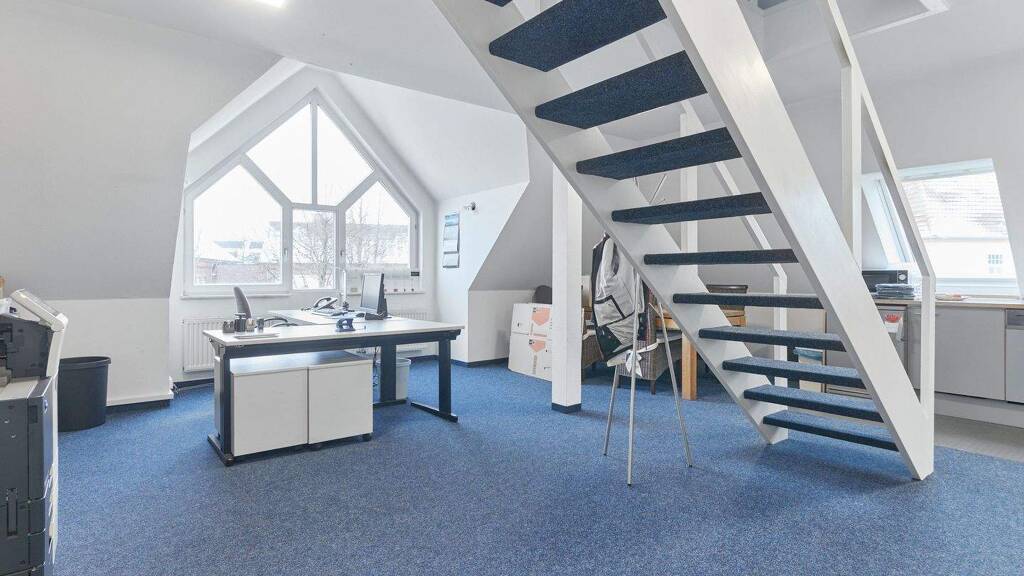 Der Zugang erfolgt über einen großzügigen Empfangsbereich, der mit einer offenen Küche, einer Treppe ins Dachgeschoss sowie zusätzlichem Platz für einen Arbeitsplatz überzeugt. Ergänzt wird die Fläche durch zwei separate Büroräume, während das offen gestaltete Dachgeschoss hervorragend für Meetings geeignet ist und ausreichend Platz für einen großen Besprechungstisch bietet.