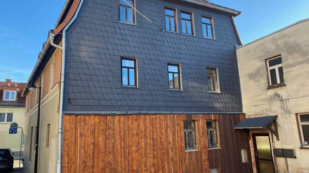 Inmitten des urbanen Lebens der Kleinstadt Auma, steht dieses vielversprechende Mehrfamilienhaus zum Verkauf, welches auf eine spannende Neugestaltung wartet. Es bietet in seiner Endphase des geplanten Ausbaus die Möglichkeit für vier großzügige Wohneinheiten. Eine der Einheiten, gelegen im ersten Obergeschoss, erstreckt sich über ca. 130 m² und ist bereits zu etwa 90 % fertiggestellt. Ein bestehendes Ölheizsystem wartet lediglich auf einige abschließende Arbeiten, während die Elektroinstallation im sanierten Wohnbereich fast vollständig funktionsfähig ist. Die weiteren noch nicht sanierten Einheiten sind im Erdgeschoss, im zweiten Obergeschoss und im Seitenflügel verteilt. Der unsanierte Bereich des Hauses sowie der Innenhof sind gegenwärtig mit Baumaterialien, Brennholz und anderen Gegenständen gefüllt, die bereit sind, eine kreative Neugestaltung zu inspirieren. Zudem liegt umfangreiches Baumaterial für den Ausbau einer zusätzlichen Etage bereits vor und ist eingelagert. Der Verkauf erfolgt in dem aktuellen Zustand des Gebäudes, dessen Dacheindeckung erst vor etwa 10-15 Jahren durch die ehemaligen Eigentümer erneuert wurde.