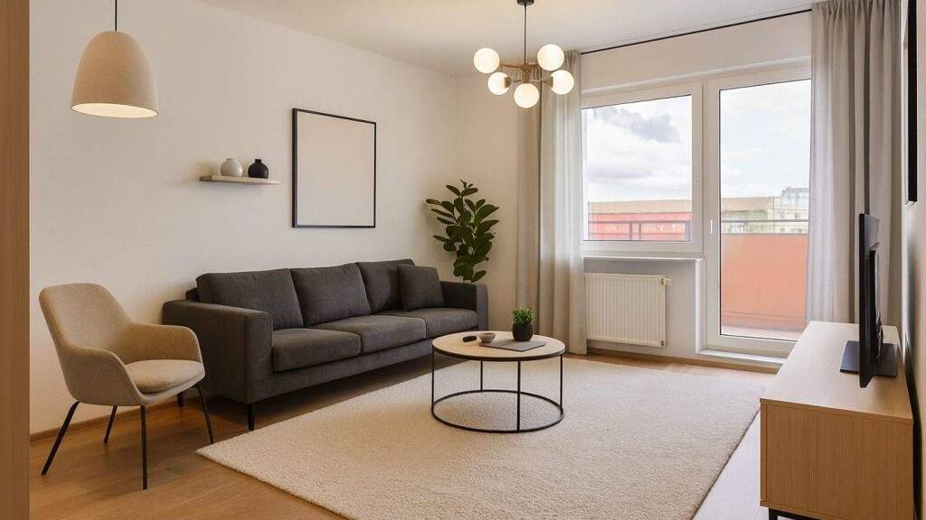 Der gut geschnittene Grundriss ermöglicht eine praktische Raumaufteilung: Vom Flur aus sind alle Zimmer direkt erreichbar. Das helle Wohnzimmer bietet ausreichend Platz für einen gemütlichen Wohn- und Essbereich. Das Schlafzimmer lässt sich individuell einrichten und bietet genügend Raum für Schrank und Bett. Das Badezimmer ist zweckmäßig ausgestattet, die Küche ist vom Wohnzimmer aus zugänglich und funktional gestaltet.
