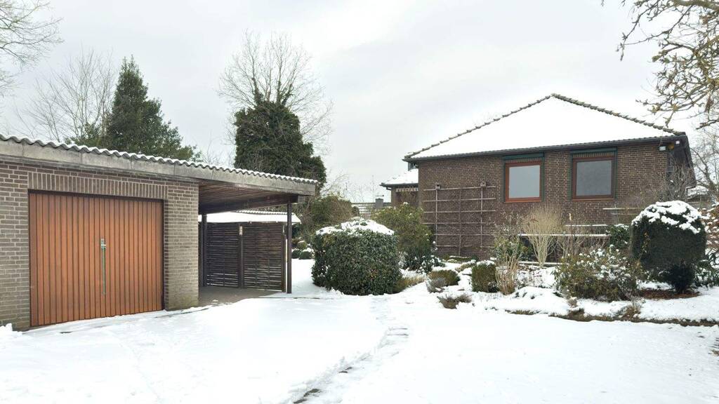 Im Außenbereich empfängt eine eindrucksvolle Auffahrt das Haus. Direkt vor dem Gebäude stehen großzügige Stellflächen für mehrere Fahrzeuge zur Verfügung, ergänzt durch eine Garage und einen Carport. Eine geschützte Terrasse lädt zum Verweilen ein, während sich hinter dem Haus ausreichend Platz für beispielsweise Gemüsebeete oder weitere Gartenideen bietet.