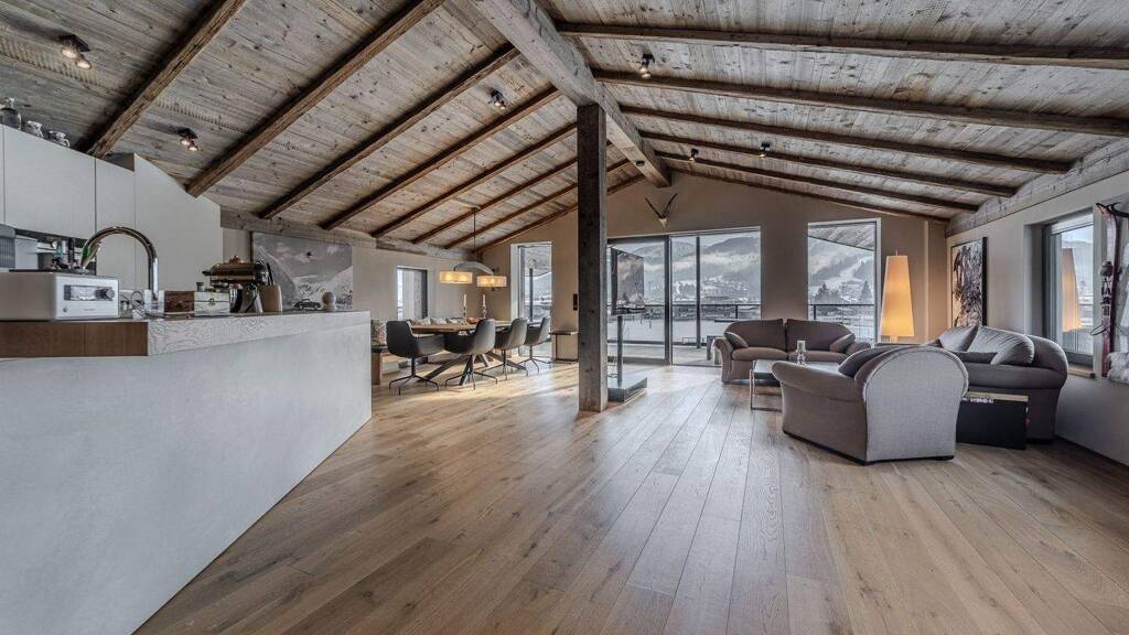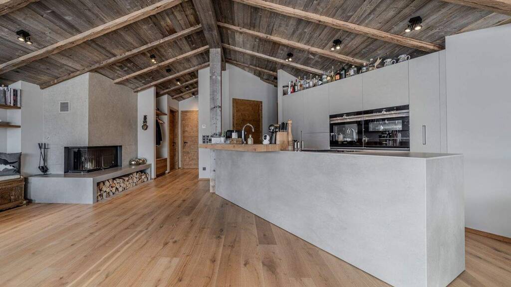 Die Wohn- und Nutzfläche beträgt ca. 164m², die reine Wohnfläche bei ca. 141m². Das Herzstück der Immobilie bildet der weitläufige Wohn- und Essbereich mit einer hochwertigen italienischen Profiküche samt Kochinsel. Ein offener Kamin sorgt für besondere Wohlfühlatmosphäre, während der sichtbare Dachstuhl in Altholz sowie edle Eichendielenböden alpinen Charme mit modernem Wohnkomfort vereinen. Großflächige Fensterfronten lassen viel Licht in die Räume und öffnen den Blick in die beeindruckende Bergwelt.