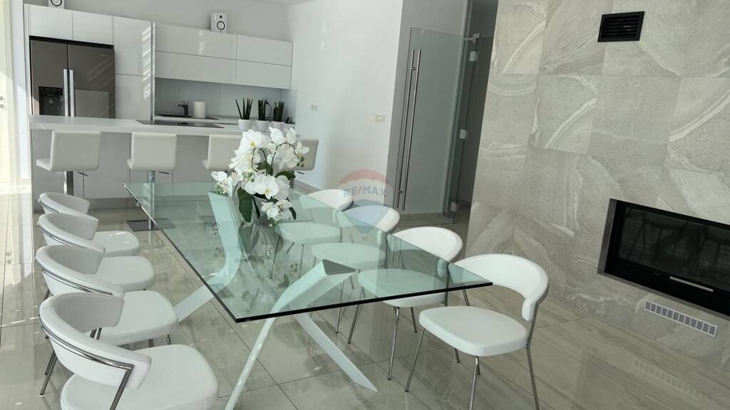 Das Erdgeschoss besteht aus einer großen Küche, einem Esszimmer, einer Toilette und einem Wohnzimmer mit großen Schiebewänden, durch die Sie in den Garten mit Swimmingpool und herrlichem Blick auf das Meer gelangen. Im Erdgeschoss gibt es eine Garage für zwei Autos und einen Abstellraum.