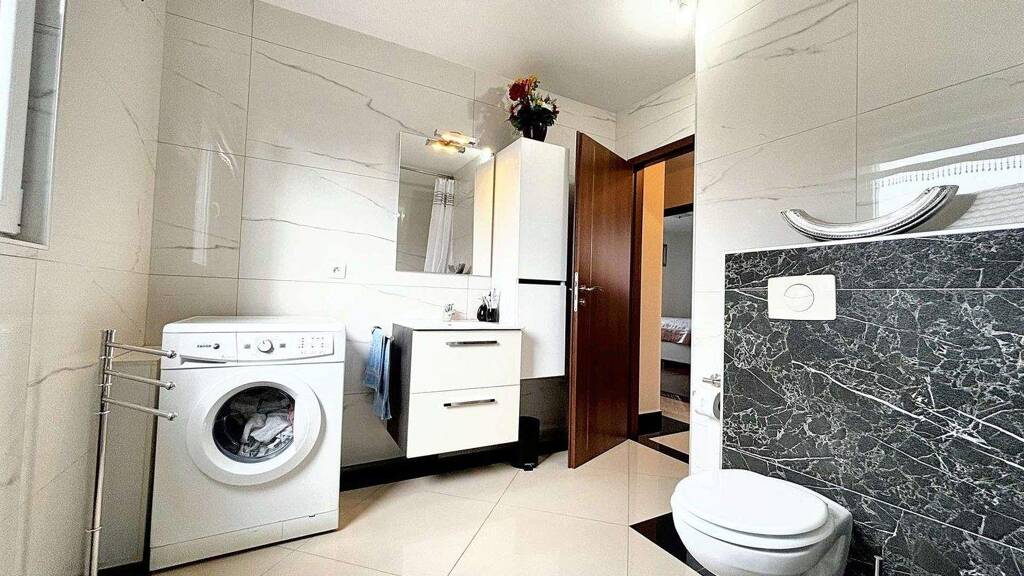 Das wunderschöne Badezimmer ist mit seiner ebenerdigen Dusche und schenkt ausgiebig Platz, um die morgendliche Hektik zu umgehen.
