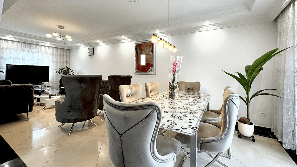 Besonders hervorzuheben sind die bezaubernden Stuckzierleisten an der Decke, die für den gewissen Charme sorgen. Beim Betreten des Hauses gelangt man vom Eingangsflur zunächst in den großen lichtdurchfluteten Wohnbereich der direkt an die Küche angrenzt, im Zentrum steht hier das gesellige Beisammensein im Kreise seiner Liebsten.