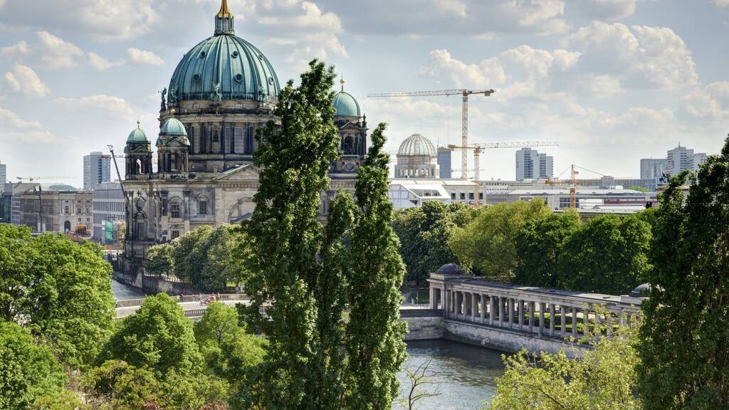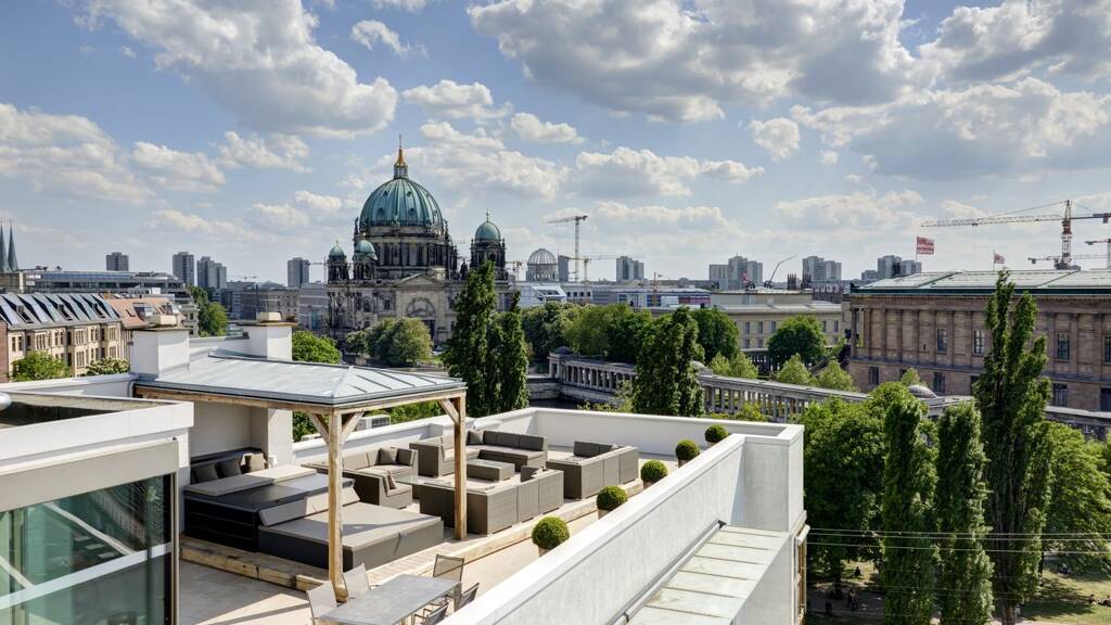. Dachterrasse mit Whirlpool und grandiosem Blick auf die Highlights von Berlin: die Museumsinsel an der Spree, der Dom, der Fernsehturm, das Humboldt-Forum und die neue Synagoge
