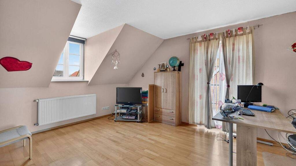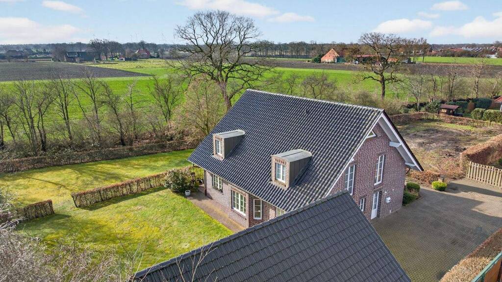 Dieses traumhaft gelegene Einfamilienhaus überzeugt durch seine großzügige Raumaufteilung, eine hochwertige Bauweise sowie eine besonders attraktive Lage mit freiem Blick über die umliegenden Felder und Wiesen. Die Immobilie bietet ein ideales Zuhause für Familien, Paare oder alle, die das Wohnen im Grünen mit viel Ruhe und Privatsphäre schätzen. Bereits beim Betreten des Hauses empfängt Sie eine großzügige Diele mit stilvoller Treppe. Von hier aus gelangen Sie in den hellen und offen gestalteten Wohn- und Essbereich, der durch große Fensterflächen mit Sprossen besonders lichtdurchflutet ist und einen wunderschönen Blick in die Natur bietet. Der großzügige Wohnbereich schafft eine angenehme Wohnatmosphäre und bietet ausreichend Platz für gemütliche Abende mit Familie und Freunden. Die angrenzende Küche ist funktional gestaltet und verfügt über ausreichend Arbeits- und Stauraum. Durch die großen Fenster und den direkten Zugang nach draußen genießen Sie auch hier viel Tageslicht sowie den Blick ins Grüne. Weiterhin befinden sich im Erdgeschoss ein Schlafzimmer mit Bad en suite, HWR sowie ein Gäste WC. Im Obergeschoss stehen Ihnen ein großzügiges Elternschlafzimmer mit separater Ankleide sowie zwei weitere Schlafzimmer zur Verfügung, die sich ideal als Kinder-, Gäste- oder Arbeitszimmer nutzen lassen. Ergänzt wird diese Etage durch ein geräumiges Vollbad mit Badewanne, Dusche und Doppelwaschbecken. Darüber hinaus befindet sich auf dieser Ebene ein separater Heizungsraum. Auch der Außenbereich lässt keine Wünsche offen. Das gepflegte Grundstück bietet viel Platz zum Entspannen oder für gesellige Stunden im Freien. Abgerundet wird das Angebot durch eine Garage mit zusätzlichem Carport die ausreichend Stellfläche für Fahrzeuge sowie zusätzlichen Stauraum im OG bietet. Beheizt wird das Haus über eine Gas-Zentralheizung. Im Erdgeschoss - mit Ausnahme des Schlafzimmers - sorgt eine Fußbodenrücklauferwärmung für angenehme Wärme, ebenso im Badezimmer im Obergeschoss. Der derzeitige monatliche Abschlag für Gas liegt bei ca. 176 €. Insgesamt präsentiert sich diese Immobilie mit großzügigem Platzangebot, einer durchdachten Raumaufteilung und einer besonders attraktiven Lage mit freiem Blick ins Grüne - ideal für alle, die ruhiges Wohnen mit Komfort und Natur verbinden möchten.