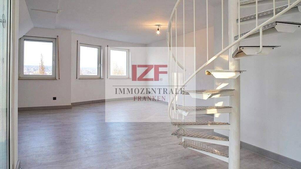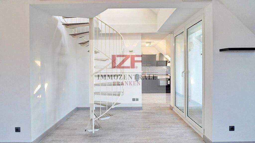 Der Zugang zur Wohnung erfolgt über das 2. Obergeschoss. Auf der unteren Ebene empfängt Sie eine einladende Diele mit Gäste-WC. Zudem stehen eine separate Einbauküche sowie ein großzügiger, lichtdurchfluteter Wohnbereich zur Verfügung. Von hier aus gelangen Sie auf die sonnige Ost-Dachloggia mit Weitblick über Oberasbach und Zirndorf - ein idealer Ort für entspannte Stunden im Freien.