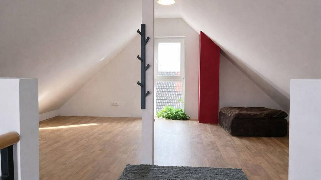 Ein besonderes Highlight ist der ausgebaute Spitzboden, der zusätzlichen Wohnraum schafft. Die sichtbare Holzbalkendecke sowie die hochwertige Holz-Stahl-Treppe sorgen für ein stilvolles Ambiente.