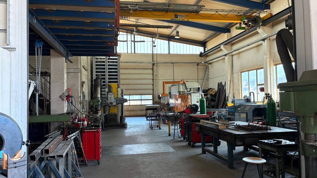 - 3 Sektionaltore (bxh=vorne ca. 4,50 m x 4,50 m, seitlich ca. 4,20 m x 4,50 m) - 1 Sektionaltor zwischen den Hallen (bxh=vorne ca. 4,50 m x 4,50 m) - 2 Kranbahnen (1,5 t und 5 t) - 1 Kran (1 t) - Stahltor abschließbar (4,50 m) - 2 PV-Anlagen - 1 Wallbox - Starkstrom-Steckdosen - Küche mit Aufenthalt - Technikraum - 3 Stellplätze