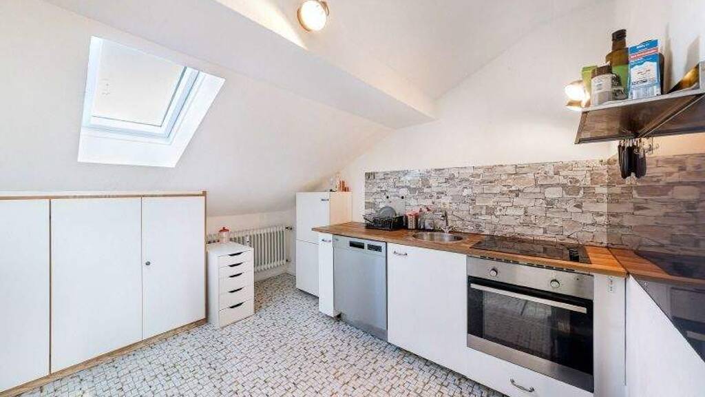 Das Schlafzimmer verfügt über einen praktischen Einbauschrank und ausreichend Platz für ein Doppelbett. Die geräumige Küche mit Dachflächenfenster bietet Platz für einen kleinen Essbereich (Einbauküche im Eigentum des Mieters). Das hell geflieste Bad ist mit Badewanne und Fenster ausgestattet.