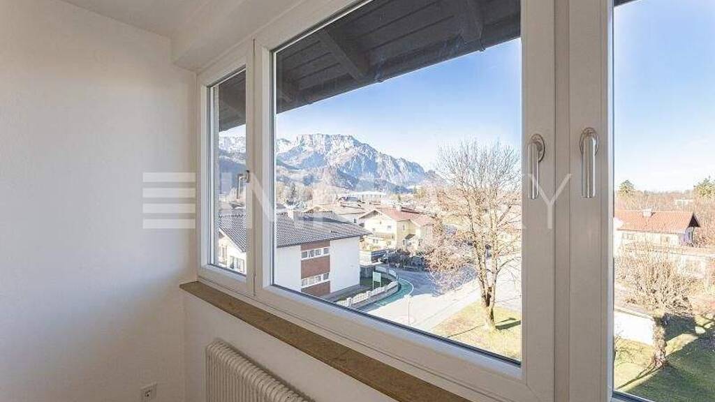 Der Grundriss bietet vielfältige Möglichkeiten für individuelle Wohnkonzepte ideal für Singles, Paare oder kleine Familien. Große Fensterflächen lassen Räume hell und freundlich wirken und tragen zu einer angenehmen Atmosphäre über den ganzen Tag hinweg bei. Ein besonderes Highlight ist der Panoramablick, der aus allen Zimmern die Salzburger Alpenlandschaft bis zum Untersberg einfängt. Die Panoramawohnung wurde jüngst renoviert und erstrahlt in frischem Glanz. Eine hochwertige Küche mit modernen Einbaugeräten der Markenvielfalt ist vorhanden; Badezimmer und WC wurden ebenfalls modernisiert. Durch die Verlegung des Boilers in den Dachboden entstand im Badezimmer mehr Platz, der nun auch eine Badewanne ermöglicht.