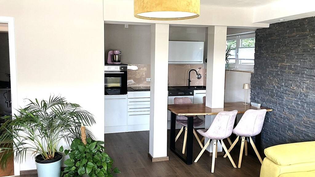 Wohnung geschmackvoll saniert Lichtdurchflutetes Wohnzimmer Neue Einbauküche Offener Wohn-Essbereich Hell gefliestes Badezimmer Großzügiger Flur Viel Abstellfläche im Keller und Dachboden Pkw-Stellplatz vor dem Haus