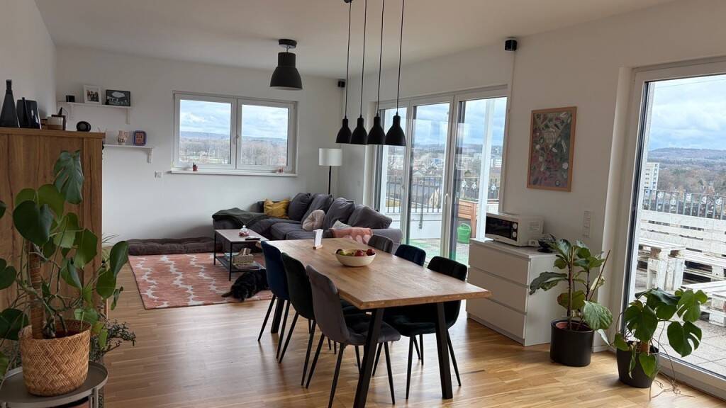 Wir beginnen den Rundgang im Eingangsbereich. Dieser führt Sie in das Herzstück des Apartments, den offenen Wohn- und Essbereich. Eine wunderschöne und zeitlose Einbauküche ist bereits vorhanden und lädt zu kulinarischen Abenden mit der Familie und Freunden ein. Von diesem Bereich aus betreten Sie die großzügige Dachterrasse mit Blick über die Dächer der Stadt. Gemütliche Abende unter freiem Himmel sind hier ebenso lohnenswert wie das sonntägliche Frühstück.