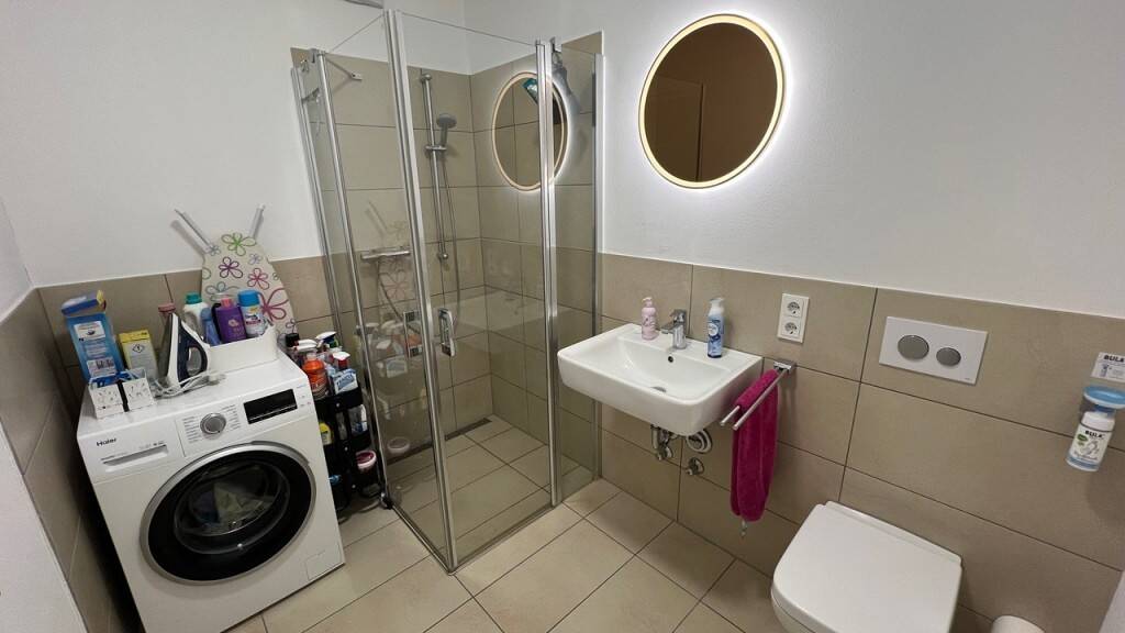 Ein modernes Tageslicht-Badezimmer mit ebenerdiger Dusche, zwei Waschbecken, einer Badewanne und einer Toilette komplettiert das Wohlfühlambiente dieser charmanten Wohnung. Schlichte, beigefarbene Boden- und Wandfliesen schmeicheln der Modernität dieses Apartments. Zusätzlich verfügt die Wohnung noch über ein zweites Badezimmer, welches mit einer bodentiefen Dusche, einem Waschbecken und einem WC ausgestattet ist. Hier haben Sie auch die Möglichkeit Ihre Waschmaschine anzuschließen.