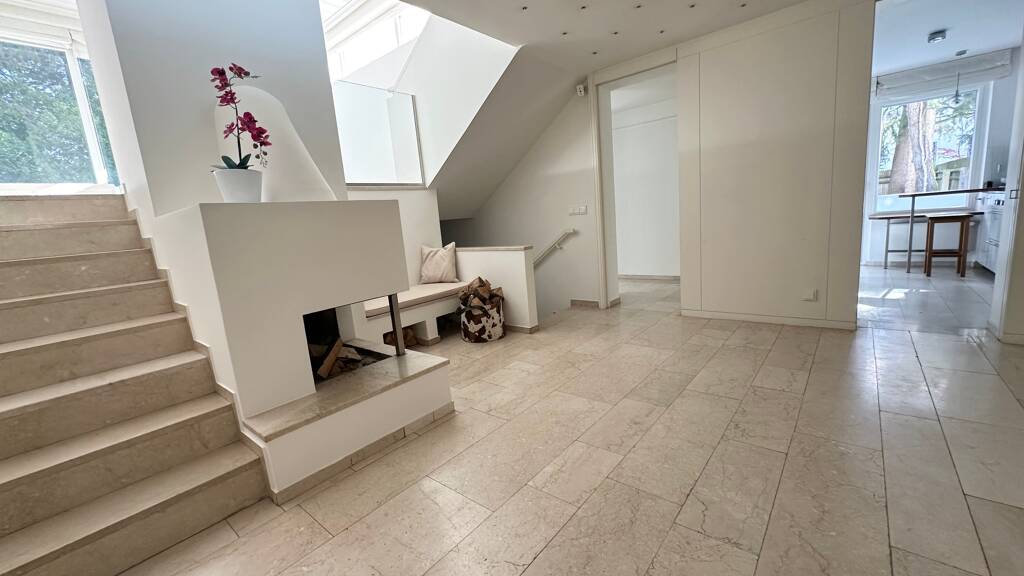 Der Grundriss ist genauso eigenwillig wie vielseitig und so geschickt, dass fast alle Räume über sehr große Fensterflächen verfügen. Somit sind diese sehr hell und freundlich. Eine formschöne Architektur empfängt einen, wenn man die Maisonette-Wohnung betritt. Subtil aufeinander abgestimmte Stilelemente unterstreichen wohltuend die reduzierte Formensprache und entfalten einen sehr modernen Gesamteffekt. Der Architekt setzt die in traditioneller Bauweise verwendeten Materialien wie Holz, Travertin, Feinstein und minimalistische Sanitärlinien ein und interpretiert diese auf ihre Weise neu.