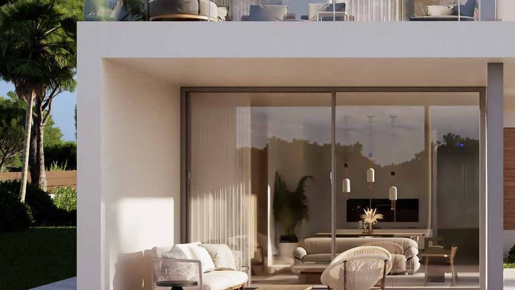 Im Erdgeschoss befindet sich zudem ein Doppelschlafzimmer mit eigenem Bad en-suite und Ankleidezimmer. Dieser Bereich bietet ebenfalls Zugang zum Garten und ermöglicht einen ungestörten Blick auf den Pool, was besonders private und erholsame Momente garantiert. Im ersten Obergeschoss befinden sich zwei weitere Doppelschlafzimmer, jeweils mit Bad en-suite. Diese Zimmer sind so konzipiert, dass sie maximalen Komfort und Privatsphäre bieten und gleichzeitig den eleganten Stil der Villa unterstreichen, wobei sie durch einen Wohnbereich miteinander verbunden sind. Auf der zweiten Etage verteilen sich weitere zwei großzügige Schlafzimmer mit Bad en-suite, eines davon mit überdachtem Balkon und einem Fitnessraum.