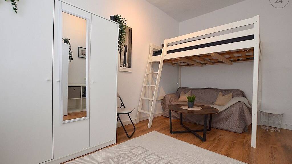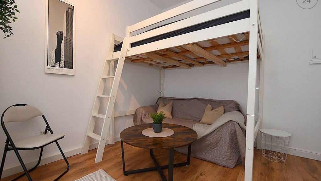 Das ca. 30m² große Apartment, welches mit Laminatboden ausgelegt ist, befindet sich im 3. Obergeschoss eines Mehrfamilienhauses. Der Wohn- und Schlafbereich ist mit einem Sofa mit Couchtisch, Hochbett mit einer 1,20m breiten Matratze, Kleiderschrank, Schreibtisch mit Bürostuhl, Stuhl und einer Kommode möbliert. Hinter einem weiteren Einbauschrank befindet sich die Singleküche, welche mit zwei Herdplatten, Kühlschrank, Kaffeemaschine, Wasserkocher und sämtlichen Küchenutensilien ausgestattet ist. Das hell geflieste Tageslichtbad verfügt über eine Dusche, Waschmaschine und ein WC. In der angegebenen Miete ist eine Betriebskostenpauschale von 180€ enthalten. Eine 1-monatige Zwischenreinigung der Räumlichkeiten muss für 80€/Monat dazugebucht werden. Bei Auszug wird eine Endreinigung je nach Aufwand mit der Kaution verrechnet. Die Innenstadt Würzburg ist fußläufig zu erreichen. Die Bus- und Straßenbahnhaltestelle ist in ca. 1 Gehminute zu erreichen.