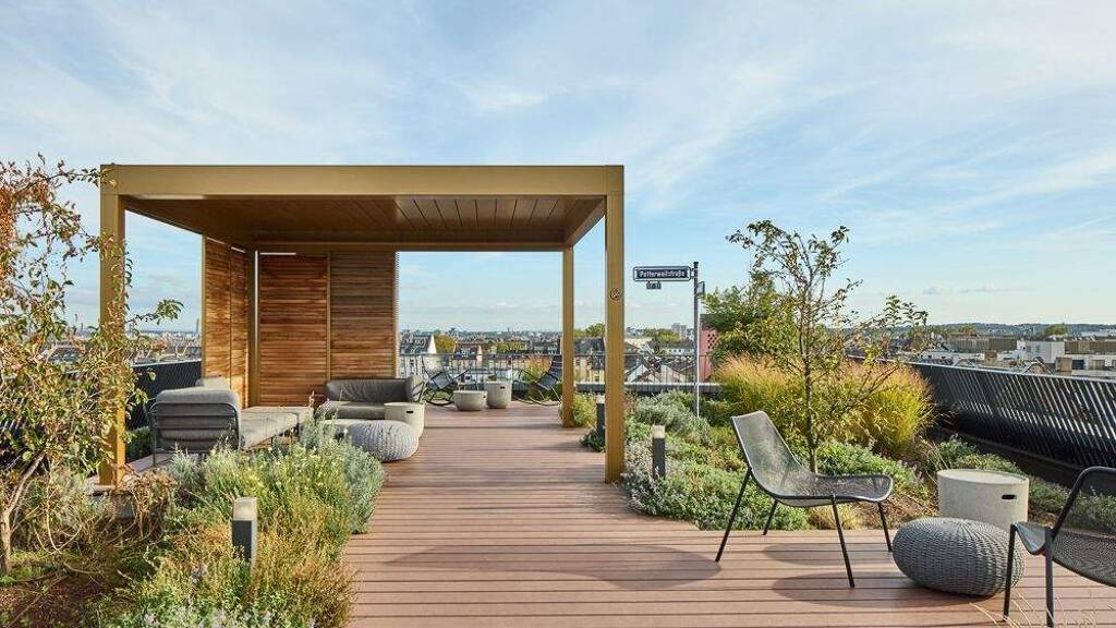 Das absolute Highlight ist das Skyline-Deck, welches sich über die gesamte Dachfläche der Penthouseetage erstreckt. Es steht allen Mietern offen und bietet Outdoormöbel, zwei Pavillons, einen eigenen Sanitärbereich und eine voll ausgestattete sowie individuell buchbare Outdoorküche. Das gesamte Deck begeistert mit einer fantastischen Aussicht auf die Frankfurter Skyline und lädt zum gemeinsamen Sundowner ein.