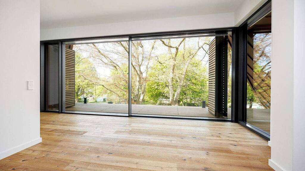 Der erstklassige Neubau fügt sich perfekt in die Umgebung ein - eine grüne Idylle angelegt mit altem Baumbestand und Wasserzugang.