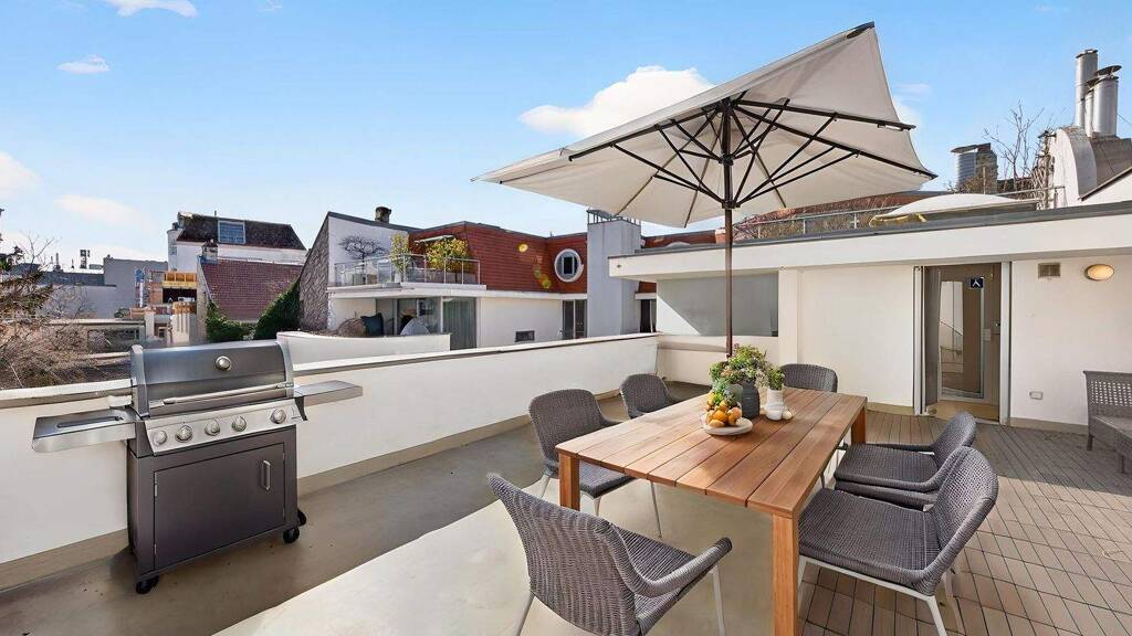 Das Erdgeschoss wird derzeit als Miniapartment mit eigener Küchenzeile genutzt, ideal als Homeoffice, Gäste- oder Jugendbereich geeignet. Die oberen Etagen bieten vielfältige Gestaltungsmöglichkeiten und lassen sich individuell nach eigenen Wünschen gestalten. Ein besonderes Highlight ist die private Dachterrasse. Ein eigener Personenaufzug (Hydrauliklift), verbindet alle Etagen. Der Lift ist derzeit außer Betrieb, kann jedoch repariert oder durch eine moderne Variante ersetzt werden. Insgesamt bietet die Wohnung rund 200 m² Wohnfläche zuzüglich Terrasse.