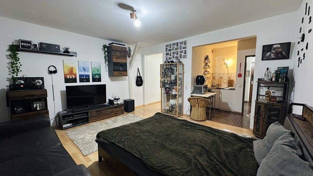 Der großzügige Wohn- und Schlafbereich bildet den Mittelpunkt der Wohnung. Helle Wände und ein gepflegter Bodenbelag schaffen eine freundliche Atmosphäre. Der Raum bietet genügend Platz für ein Bett, eine Sofaecke sowie Stauraum und überzeugt durch seine angenehme Größe und klare Struktur. Angrenzend befindet sich ein kleiner zusätzlicher Raum, der sich hervorragend als Leseecke, Homeoffice oder separater Rückzugsbereich nutzen lässt.