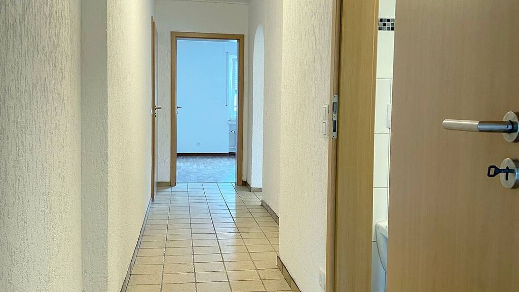 Auf der rechten Seite des Flurs liegt das großzügige Wohnzimmer mit Essbereich, von dem aus Sie direkten Zugang zum Balkon haben. Von hier genießen Sie einen schönen Blick ins Grüne, der die ruhige Lage der Wohnung unterstreicht.