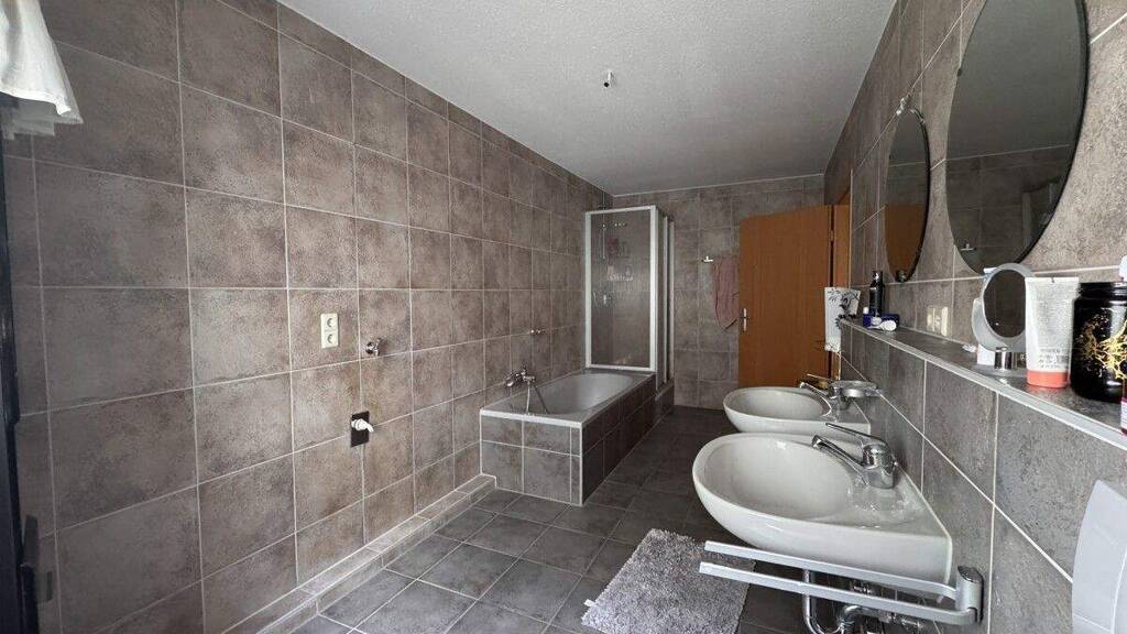 Das Badezimmer ist hochwertig ausgestattet mit Dusche, Badewanne, Doppelwaschbecken, WC und einem Waschmaschinenanschluss. Ein zusätzliches, separates Gäste-WC mit Handwaschbecken sorgt für Komfort im Alltag. In den Wohnräumen wurde Laminat verlegt, während die Nassbereiche mit pflegeleichten Fliesen ausgestattet sind - eine gelungene Kombination aus Stil und Funktionalität.