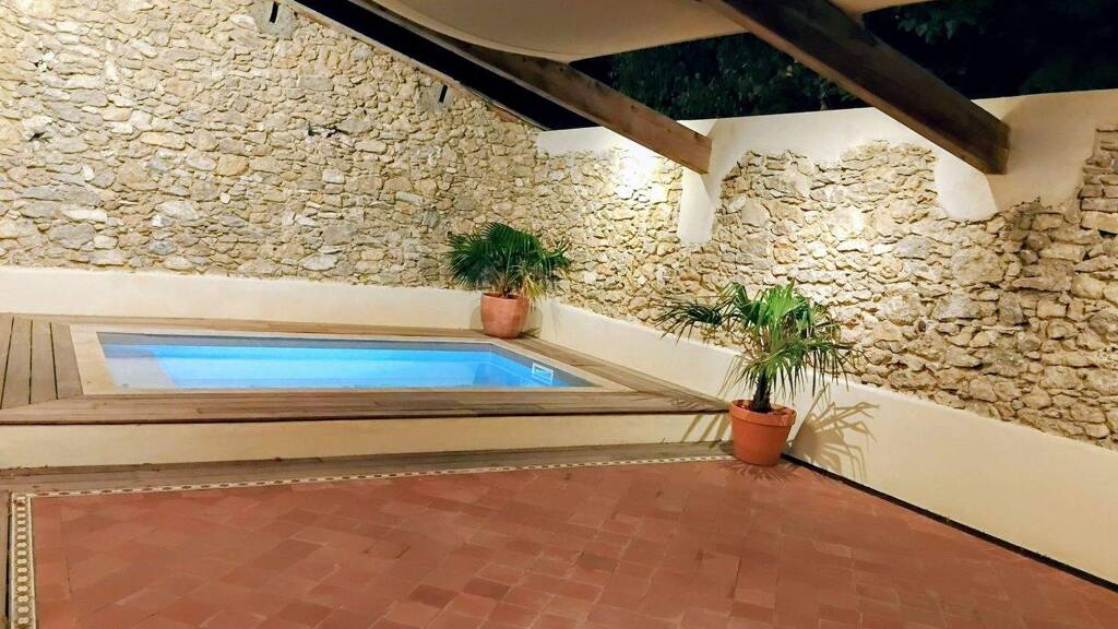 Der Außenbereich (80 m²) umfasst eine Zufahrt für Autos, einen Abstellraum (8 m²) und einen Swimmingpool (4 x 2,5 m) mit automatischer Elektrolysebehandlung und Wärmepumpe.