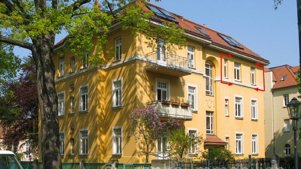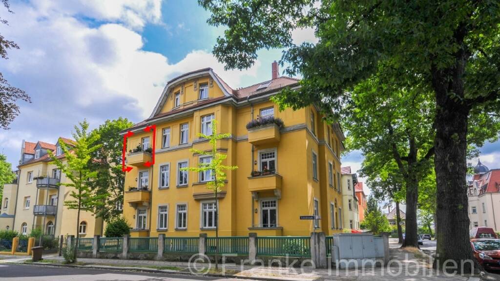 1920 erbauter, 1999 umfassend sanierter, denkmalgeschützter sehr schöner Altbau im Jugendstil mit 11 Eigentumswohnungen - stilvolle Fassade mit Sandsteinelementen und -verzierungen, Erkern und Bemalung - schön geschnittene 3-Zimmer-Wohnung im 2. OG - Wohnzimmer mit kleinem Westbalkon - Tageslichtbad - separate Küche - Abstellraum in der Wohnung - Kellerabteil - Fahrradraum - Trockenraum - Außenstellplatz im Grundstück (aktuell nicht vermietet) - Wohnung vermietet für eine monatliche Kaltmiete von 730,00 €