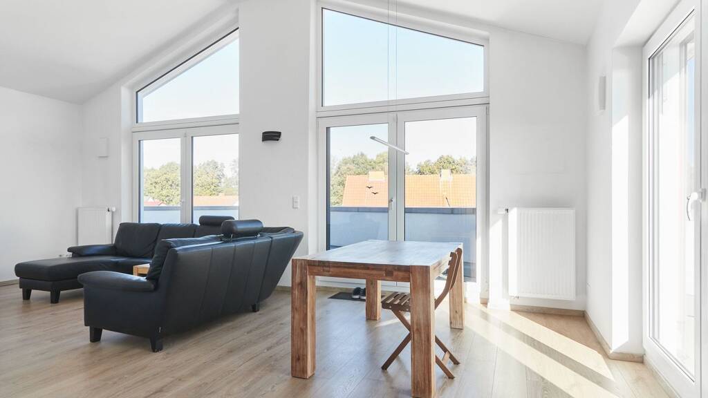 Nach Betreten der Penthouse-Wohnung fällt zuallererst die Helligkeit auf: Bodentiefe Fenster in der gesamten Wohnung verleihen ein unglaubliches Wohnambiente. Linker Hand des Wohnungseingangs gelegen, empfängt Dich der Wohnbereich, dessen Fenster der Räumlichkeit einen Hauch von Exklusivität verleihen und schon den tollen Ausblick erahnen lassen. Du kannst Deine ganz persönliche Note in die Einrichtung einfließen lassen und die Größe des Raumes voll und ganz auskosten, denn die Küche ist separiert. So lässt es sich problemlos einen großen Lounge-Bereich und einen separaten Essbereich gestalten.