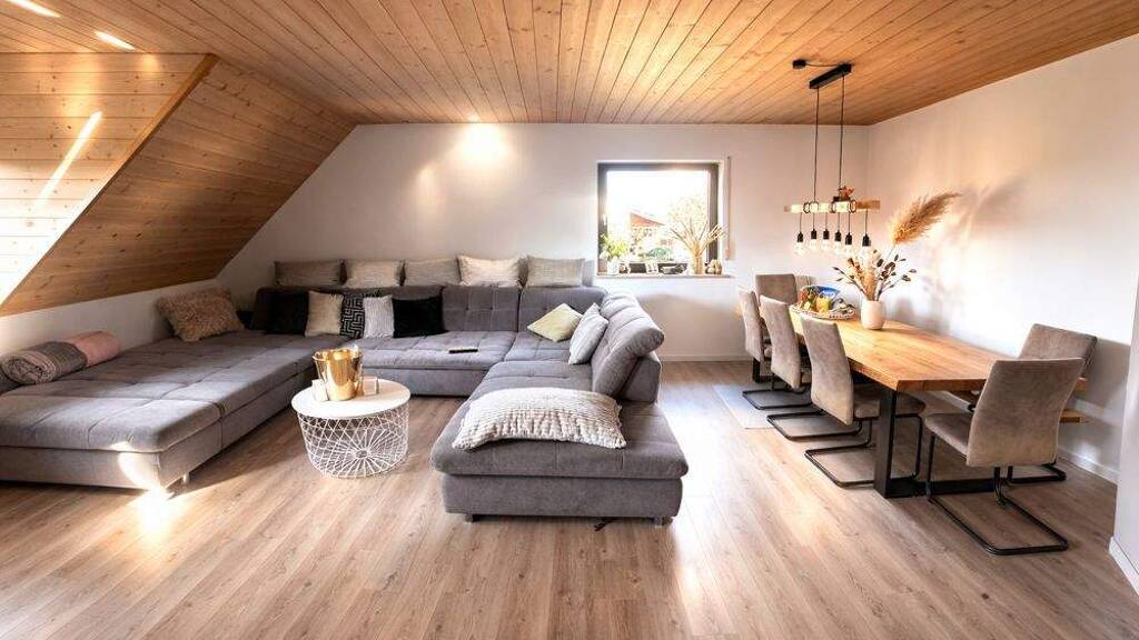 Die Gesamtwohnfläche von rund 220 m² verteilt sich auf das Erdgeschoss mit ca. 117 m² und das Dachgeschoss mit ca. 102 m².