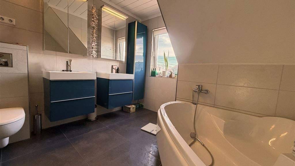 Im Obergeschoss befinden sich drei weitere Zimmer sowie ein modernes Tageslichtbad mit Wanne und Dusche. Das ausgebaute Dachgeschoss bietet zusätzlichen Raum, etwa als Arbeits- oder Gästezimmer.