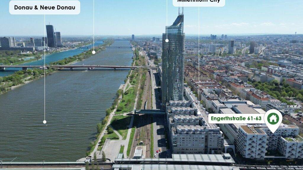 Die Wohnungen sind mit einer Einbauküche ausgestattet und verfügen über eine Freifläche sowie einen kleinen Spielplatz im Innenhof. Darüber hinaus steht allen Bewohnern eine Dachterrasse zur Verfügung. Die unmittelbare Nähe zur U-Bahn- und S-Bahn-Station Handelskai gewährleistet eine komfortable Anbindung an das öffentliche Verkehrsnetz. Dadurch gelangen Sie schnell und einfach in die Wiener Innenstadt. Zusätzlich stehen Ihnen in der Millennium City eine breite Palette an Einkaufs- und Restaurantoptionen zur Verfügung.