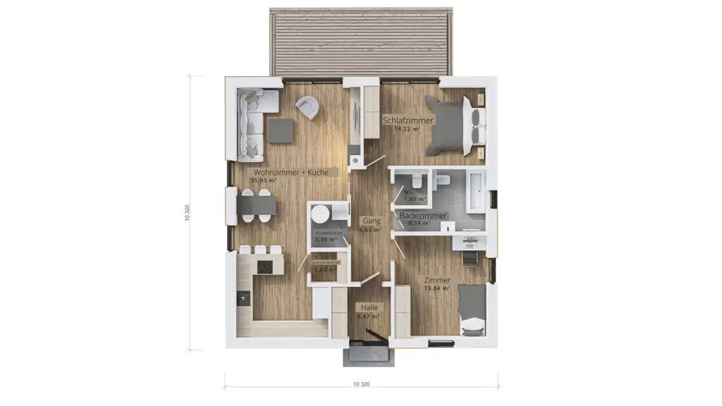 Mit 3 Zimmern, einer großzügigen Wohnküche und einem praktischen Technikraum bietet das Easy 90 ausreichend Platz für Familien oder Paare. Auch der Dachboden kann bei Bedarf genutzt werden, um zusätzlichen Stauraum oder Wohnfläche zu schaffen.