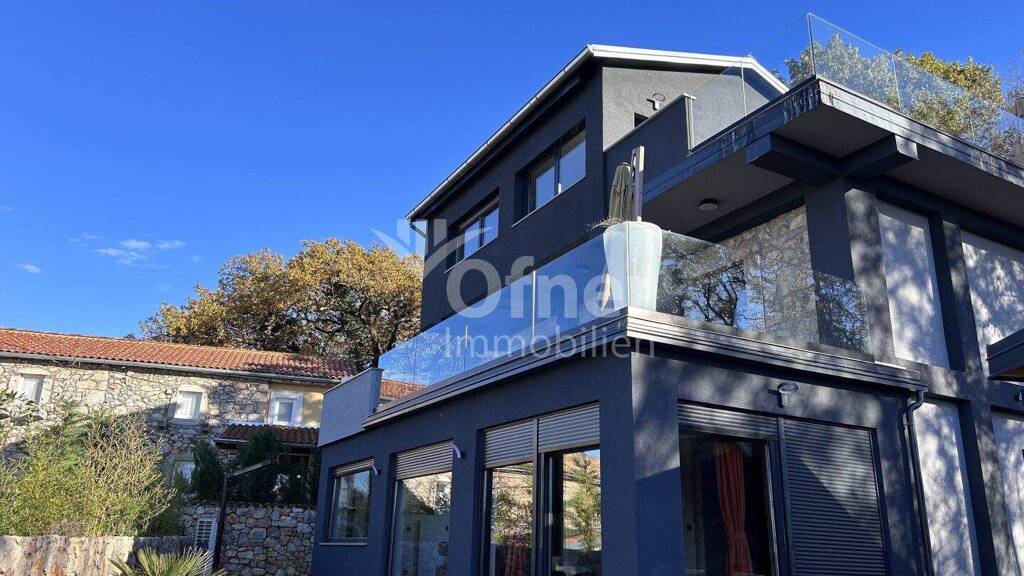 Ein Haus zum Verkauf in ruhiger Lage am Rande einer Grünzone. Das Haus mit einer Fläche von 226,19 m2 besteht aus einem Erdgeschoss und zwei Etagen. Im Erdgeschoss gibt es eine Küche mit Esszimmer (32,09 m2), ein großes Wohnzimmer von 19 m2, ein Badezimmer und eine Sauna. Im ersten Stock befinden sich zwei Schlafzimmer mit jeweils eigenem Bad, eine große Terrasse von 27,47 m2 mit freiem Blick ins Grüne. Die zweite Etage besteht wie die erste aus zwei Schlafzimmern, zwei Badezimmern und einem Vorraum mit Zugang zur Terrasse. Hochwertige Materialien; Bodenbeläge - Parkett und erstklassige Keramik, Fußbodenheizung über Wärmepumpe sowie Klimaanlagen. Zum Meer sind es 3 km, zur Stadt Krk 15 km und zur nahegelegenen Stadt Malinska 10 km. Das Haus verfügt über einen 700 m2 großen Garten mit Swimmingpool und Liegewiese. Es gibt genügend Platz, um mindestens 3 Autos zu parken. Diese Villa ist eine ideale Gelegenheit für zukünftige Eigentümer, Naturliebhaber oder kann zur touristischen Vermietung gekauft werden.