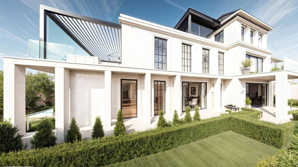 Die klare Linienführung und die harmonischen Proportionen verleihen dem Gebäude eine ruhige, repräsentative Ausstrahlung. Hochwertige Stilelemente wie zurückgesetzte Säulen, fein gearbeitete Gesimse und eine dezent integrierte Fassadenbeleuchtung unterstreichen den exklusiven Charakter dieser Immobilie - sowohl bei Tag als auch in stimmungsvoller Abendbeleuchtung.