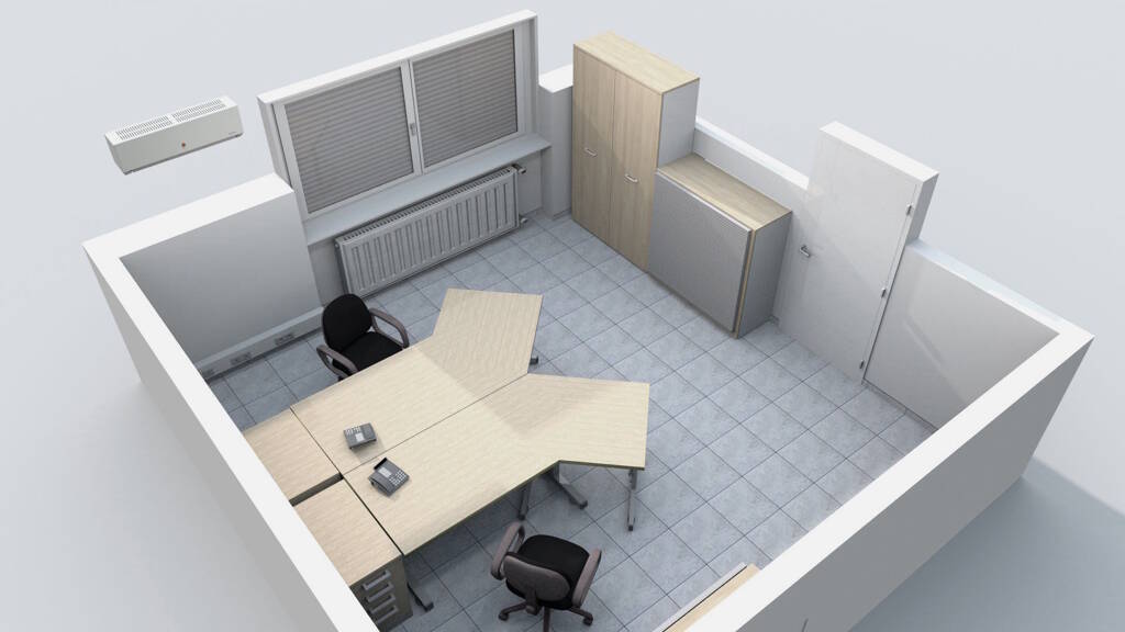 Das Büro ist mit zwei Arbeitsplätzen ausgestattet, die jeweils aus • einem Bürostuhl, • einem hydraulisch höhenverstellbaren Winkel-Schreibtisch, • einem Sockelcontainer und • einem Telefon bestehen. Eine eigene Rufnummer kann in die Telefonanlage des Hauses integriert werden. Darüber hinaus gibt es drei jeweils 1,20 m breite Aktenschränke in den Höhen 2 m, 1,25 m und 0,85 m.