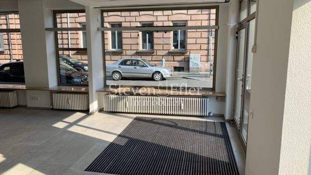 Der Ladenbereich ist baulich eigenständig erschlossen und besitzt einen separaten, straßenseitigen Zugang, der vollständig vom allgemeinen Eingangsbereich der Büro- und Wohneinheiten getrennt ist. Der Erdgeschossbereich ist mit einer hochwertigen Natursteinfassade ausgeführt und wird von großzügigen, nahezu bodentiefen Schaufensterflächen geprägt, die dem Ladengeschäft eine sehr gute Sichtbarkeit und Werbewirkung verleihen.