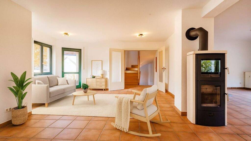 Das Herzstück des Hauses liegt im 1. Obergeschoss: ein beeindruckender Wohnbereich mit rund 55 m² Fläche. Der Schwedenofen sorgt für eine gemütliche Atmosphäre, während sich der Raum perfekt in einen großzügigen Wohn- und Essbereich mit direktem Zugang zur großen Terrasse verwandeln lässt