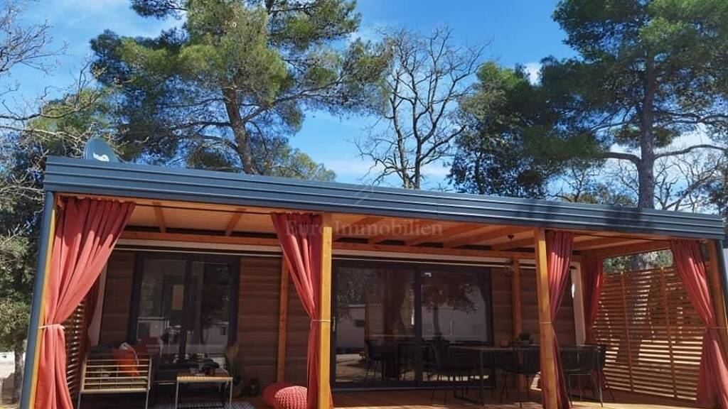Zum Verkauf steht ein komplett eingerichtetes Fertighaus Modell Veezia, mit einer etwas größeren Kapazität als das klassische 4 + 2 Personen, in ausgezeichneter Lage in Biograd na Moru. Die Fläche des Mobilheims beträgt 63 m2. Es befindet sich im Campingplatz.