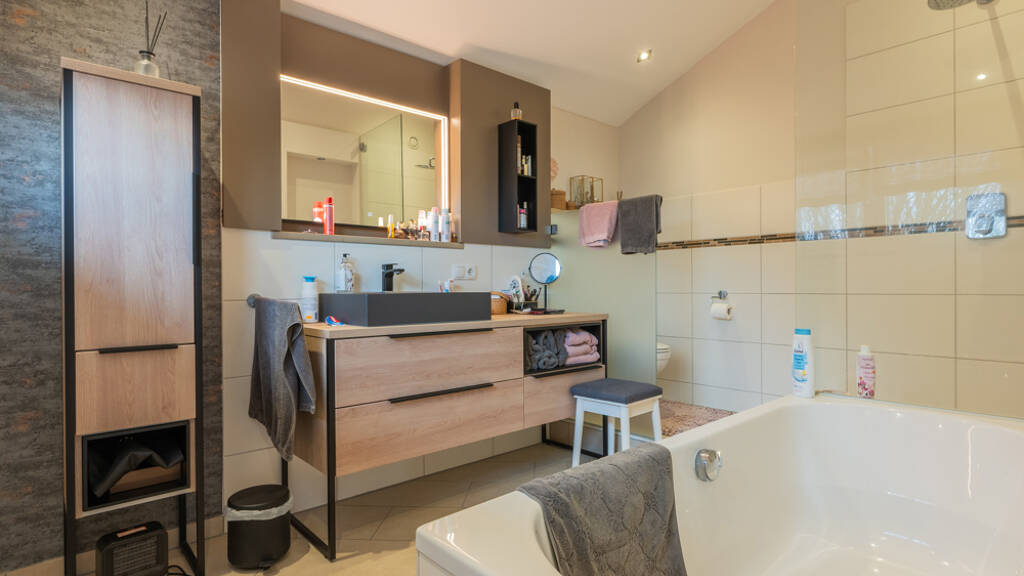Auf der Schlafebene im Obergeschoss ist ein echtes Highlight der Elternschlafbereich, dieser besteht aus Schlafzimmer mit Ausgang zur großzügigen Dachterrasse, Ankleide sowie dem Hauptbad ausgestattet mit Badewanne, Dusche, WC und Waschtischanlage. Die 2 Kinderzimmer verfügten über ein eigenes Kinderbad, ausgestattet mit Dusche, WC, Waschbecken. Die großzügigen Fenster sind mit elektrischen Rollos ausgestattet. Als Bodenbeläge wurden fast ausnahmslos Fliesen verbaut, im Wintergarten Steinbelag. Nahezu ums ganze Haus umlaufend gibt es eine Bankirai Terrasse. Für ein angenehmes Wohnklima sorgt die im Haus verbaute Lüftungsanlage. Die Gas-Zentralheizung besitzt ihrerseits einen Pufferspeicher. Im Wohnzimmer und im Wintergarten gibt es die Möglichkeit einen Festbrennstoffofen anzuschließen.