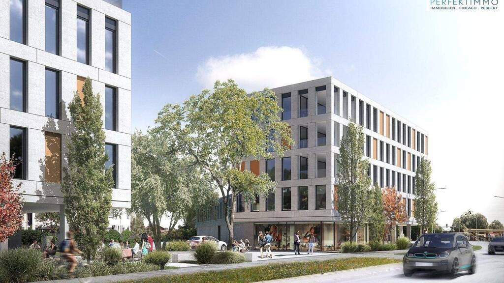 Der Neubau besteht aus einem architektonisch klar gestalteten Gebäudekomplex mit zwei Hauptgebäuden, die sich eine gemeinsame Garage teilen. Während eines der Gebäude in naher Zukunft als Hotel ausgeführt wird, befindet sich im zweiten Baukörper, der bereits in Errichtung ist, ein Wohn- und Geschäftsgebäude, in dem die hier angebotenen Wohnungen und Büroflächen ab Juli 2026 zur Vermietung stehen. Dieses Gebäude gliedert sich in zwei in ihrer Höhe abgestufte Baukörper. Der größere Teil beherbergt Wohn-, Büro- und Geschäftseinheiten, während im angrenzenden Bereich eine Halle zur gewerblichen Nutzung vorgesehen ist. Ein moderner, behindertengerechter Aufzug verbindet sämtliche Ebenen miteinander und sorgt für eine komfortable Erreichbarkeit aller Bereiche.